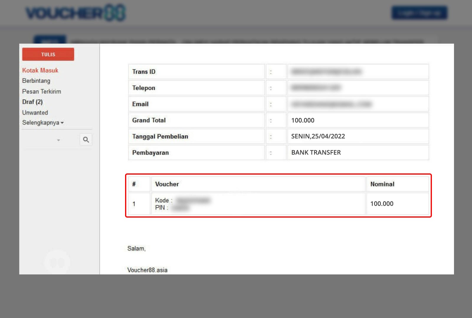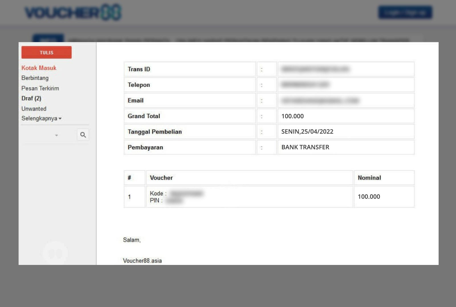 10. Setelah Anda melakukan transfer sejumlah uang ke rekening kami dan jika transferan itu sudah kami terima. Maka Anda akan mendapatkan Kode Voucher di Email yang telah terdaftar di akun Anda.