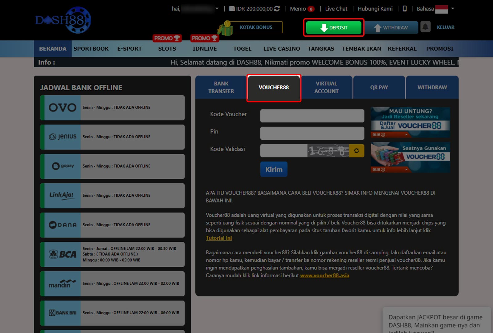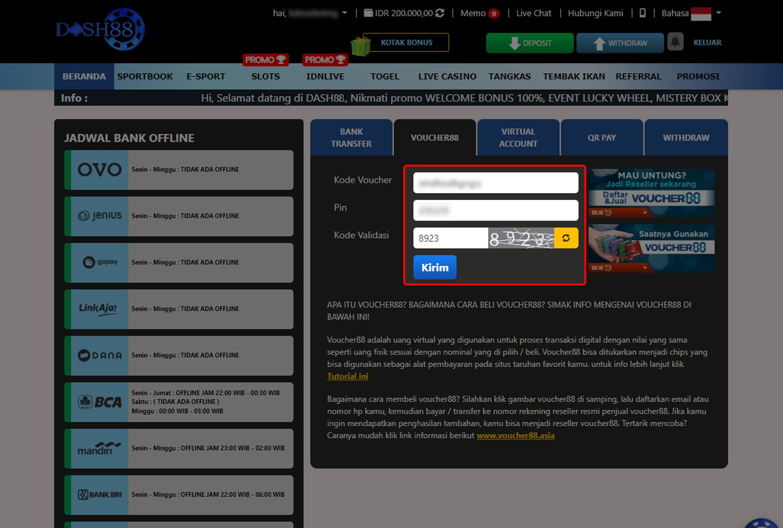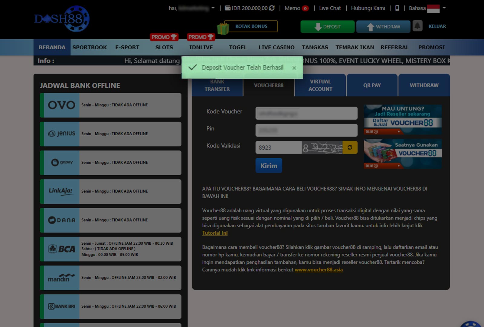 PENTING: Harap di perhatikan bahwa Voucher88 akan kami proses jika Anda mengirimkan uang dari Nama Rekening yang Anda daftarkan. Kami tidak menerima pengiriman uang dari nama yang berbeda yang ada di akun Anda.
